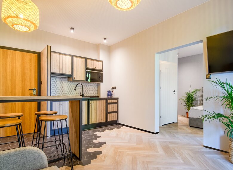 W apartamentach znajdują się świetnie wyposażone aneksy kuchenne (tylko rodzic wie jak przydatne bywają!), a poza tym wszystkie pokoje mają dostęp do social roomu ze wspólną kuchnią.